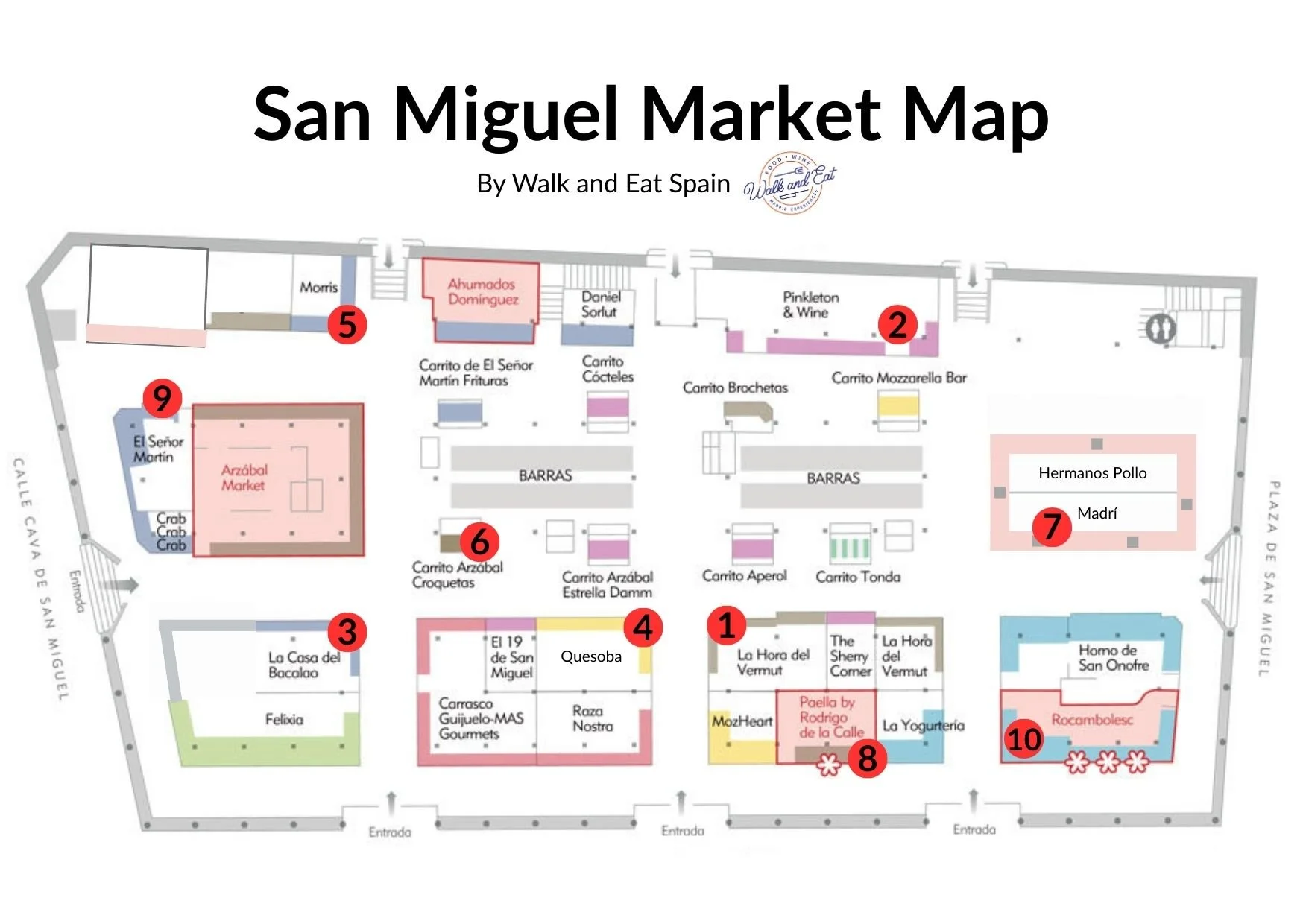 This map of the San Miguel Market shows our top 10 picks for where to eat in Madrid’s most famous market!