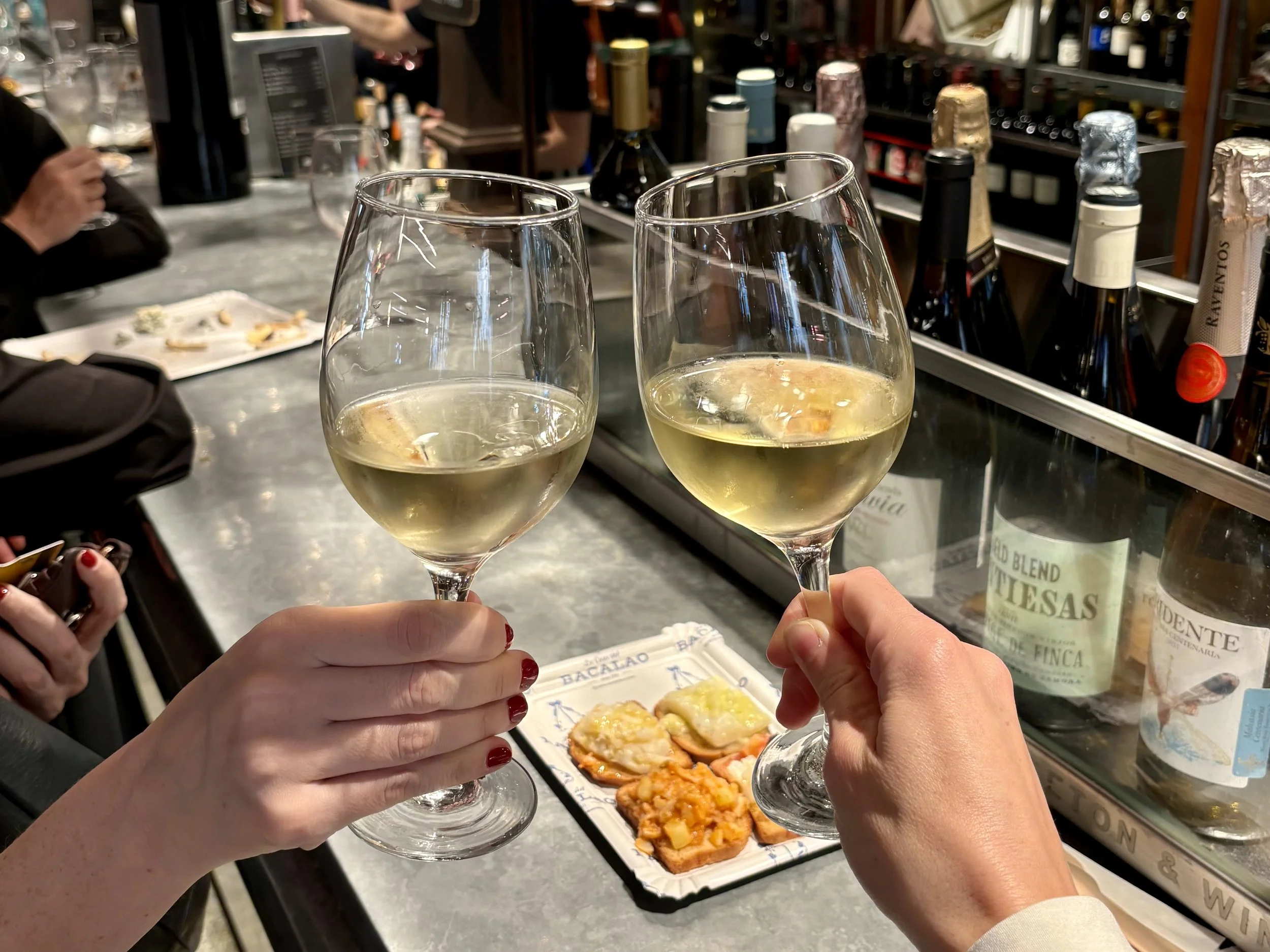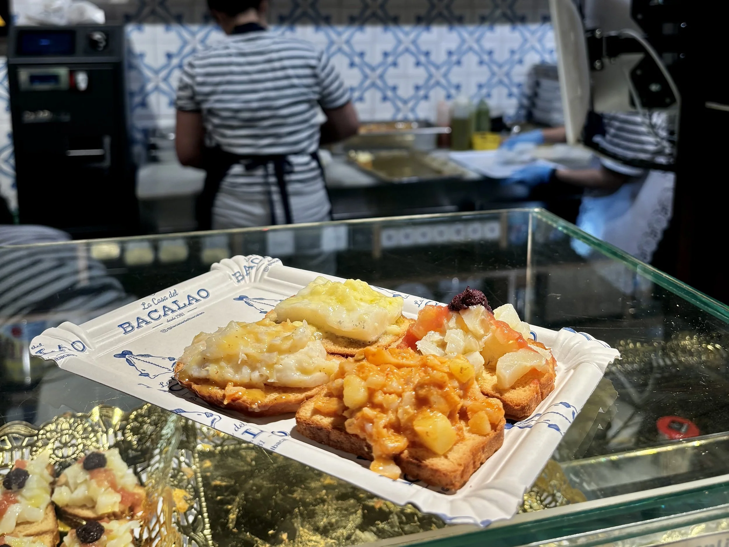 Salted cod has been a staple of the Spanish diet for centuries. At the Casa de Bacalao in the San Miguel Market, they prepare this essential Spanish ingredient in over a dozen ways, all of which are heaped onto two-bite-sized crispy crackers.